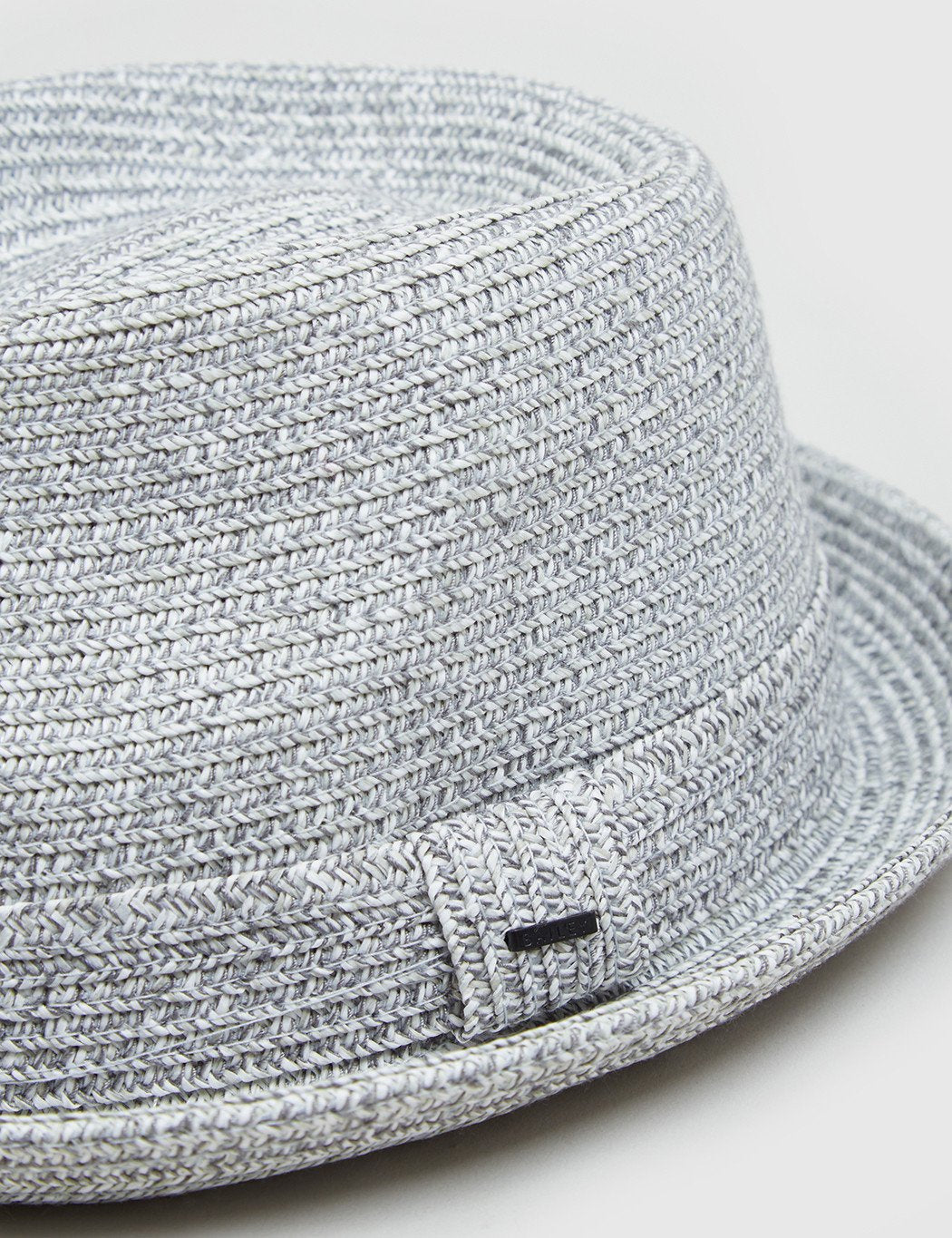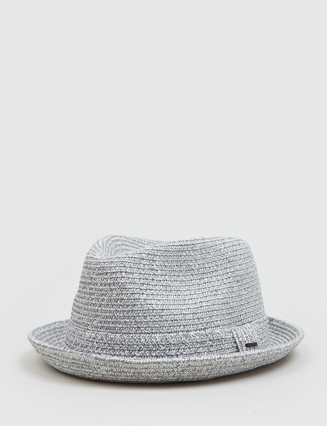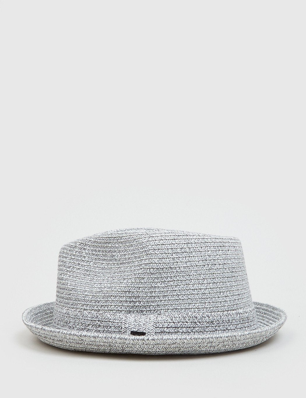 The Billy hat is an unlined braided trilby made from paper braid blend. It features a teardrop crown, woodmark metal logo, tonal headband and woven polyester sweatband.