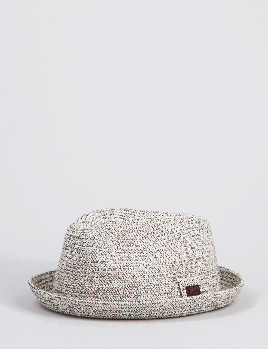 The Billy hat is an unlined braided trilby made from paper braid blend. It features a teardrop crown, woodmark metal logo, tonal headband and woven polyester sweatband.