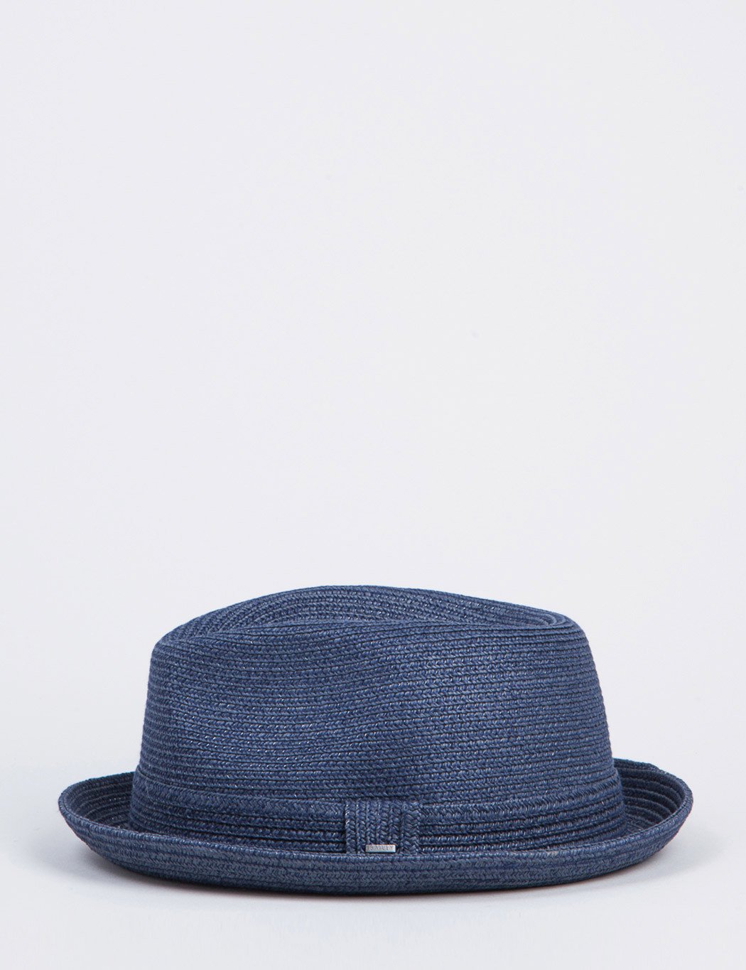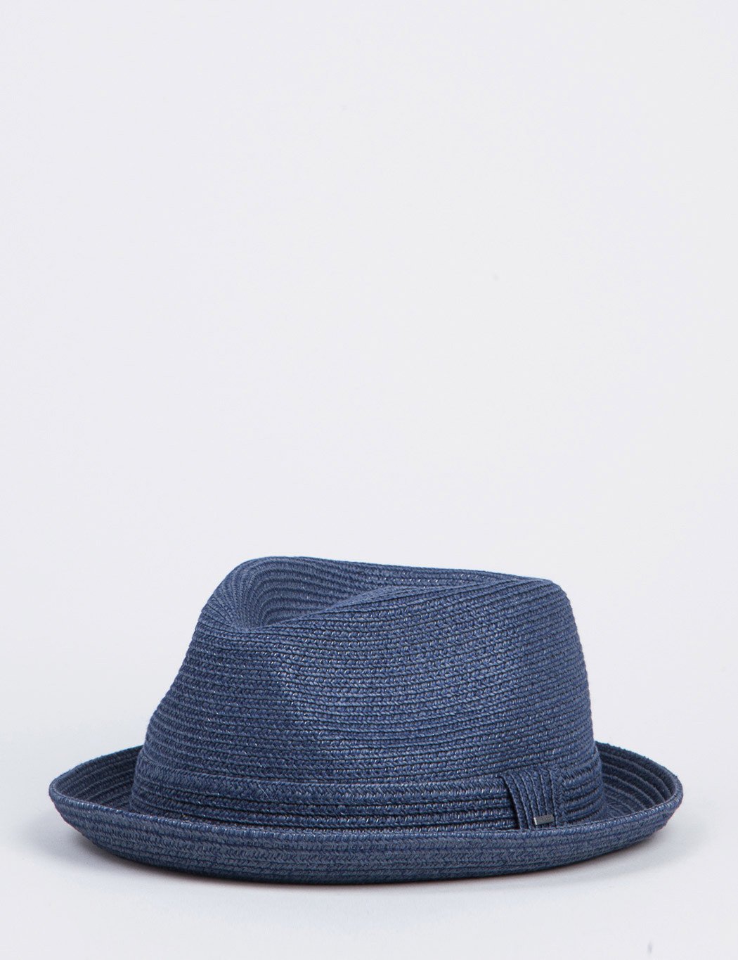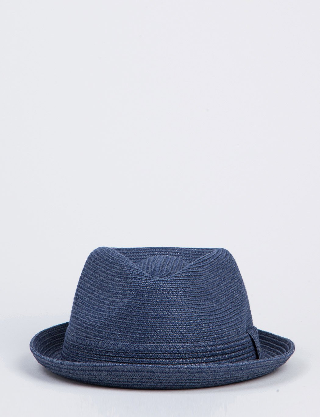 The Billy hat is an unlined braided trilby made from paper braid blend. It features a teardrop crown, woodmark metal logo, tonal headband and woven polyester sweatband.