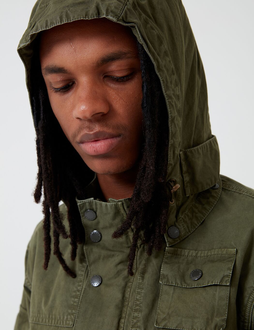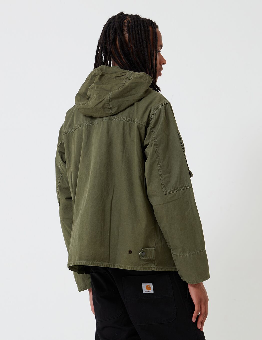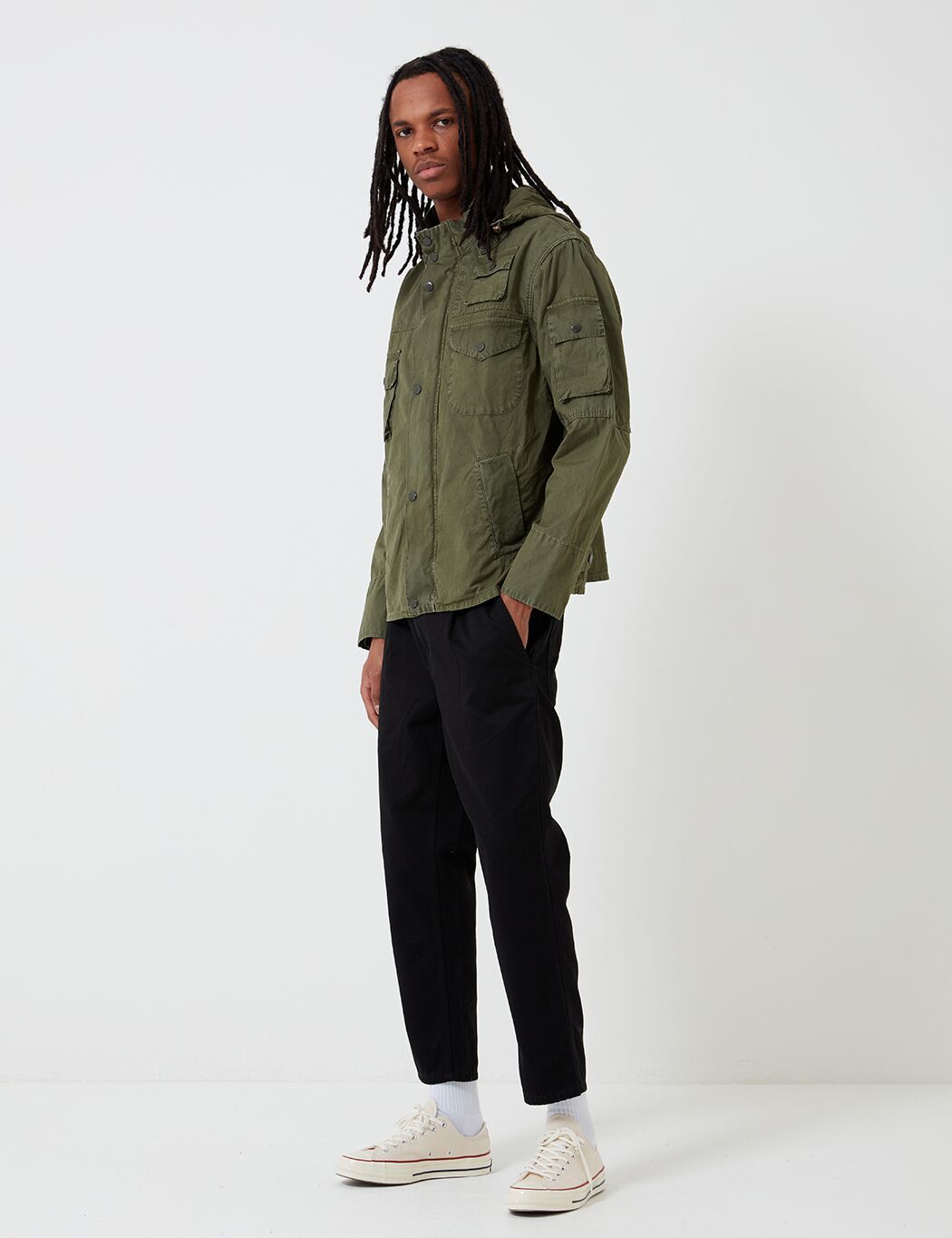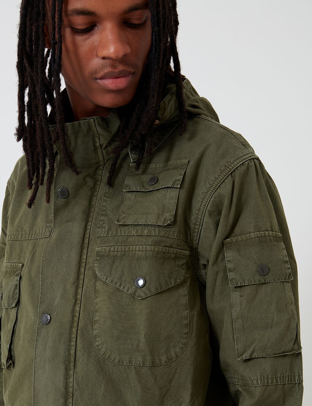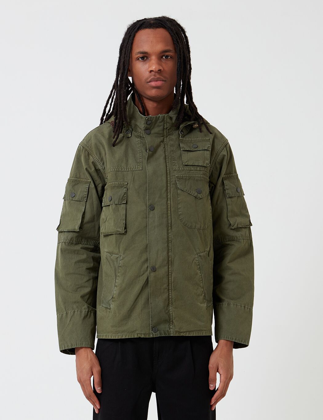 The Engineered Garments x Barbour Cowen Casual jacket in washed waxed cotton. Developed with inspiration from Barbour's heritage, it offers an array of patch pockets, stand up collar with detachable hood, button tabs at waist for a fitted silhouette.